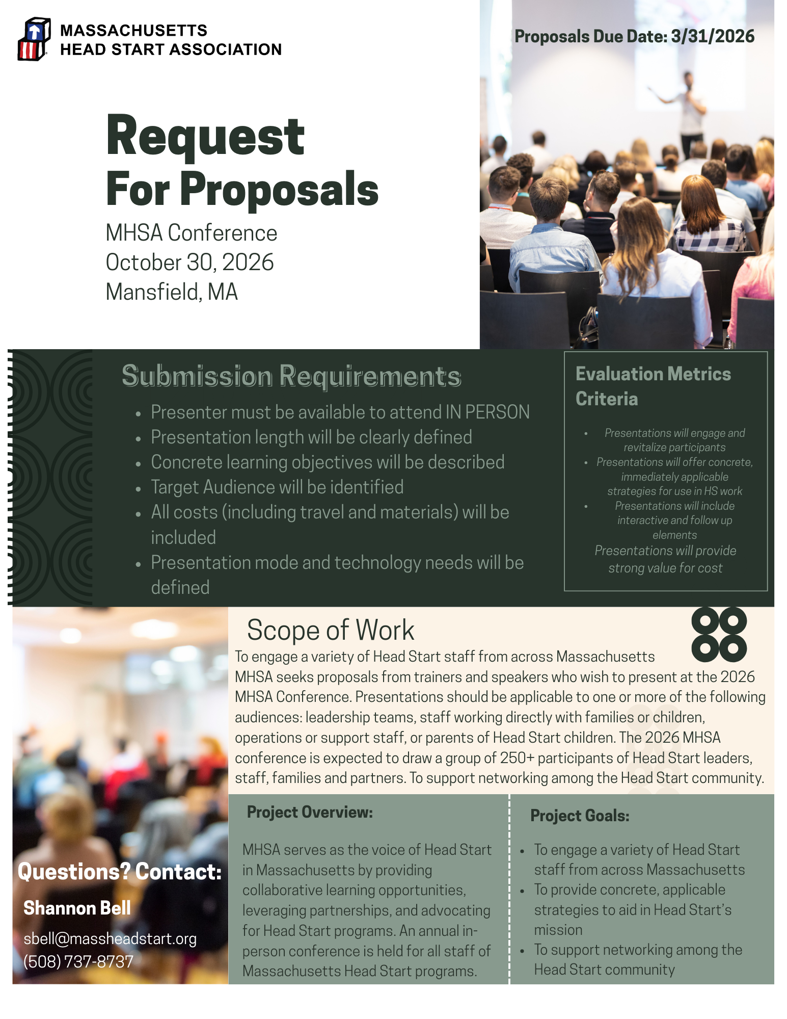 MHSA is seeking proposals from speakers, trainers and Head Start staff for our annual Fall Conference this October 30, 2026. Find out more and submit proposals by clicking below!