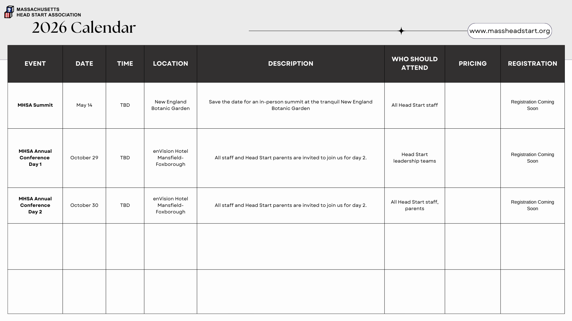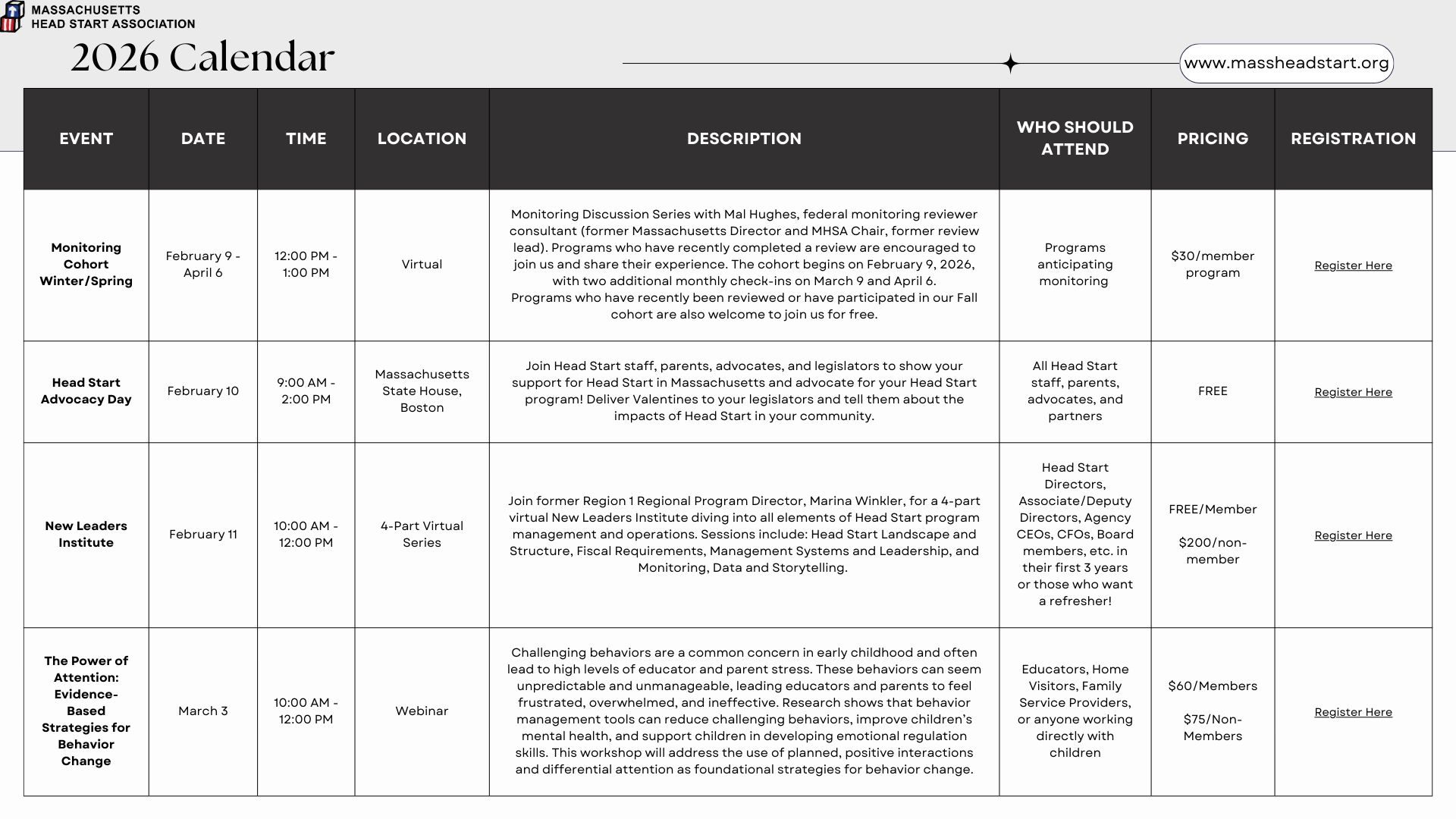 To register for an event, please use the events drop down to find your event and corresponding registration. You may also click the links in the downloaded PDF to access registration.
